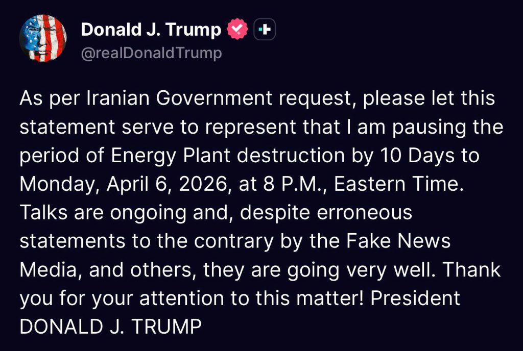 كتب الرئيس الاميركي دونالد ترامب في منشور: “بناءً على طلب الحكومة الإيرانية، يُرجى اعتبار هذا البيان تأكيداً على أنني أُعلّق فترة استهداف وتدمير منشآت الطاقة لمدة 10 أيام، وذلك حتى يوم الإثنين 6 نيسان 2026، الساعة 8 مساءً بتوقيت الساحل الشرقي”.