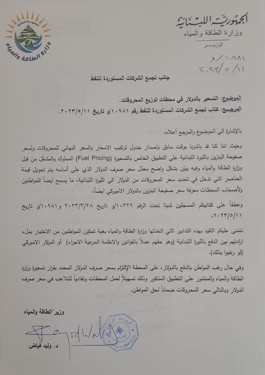 أصدر وزير الطاقة تعميماً يجيز تسعير المحروقات بالدولار.