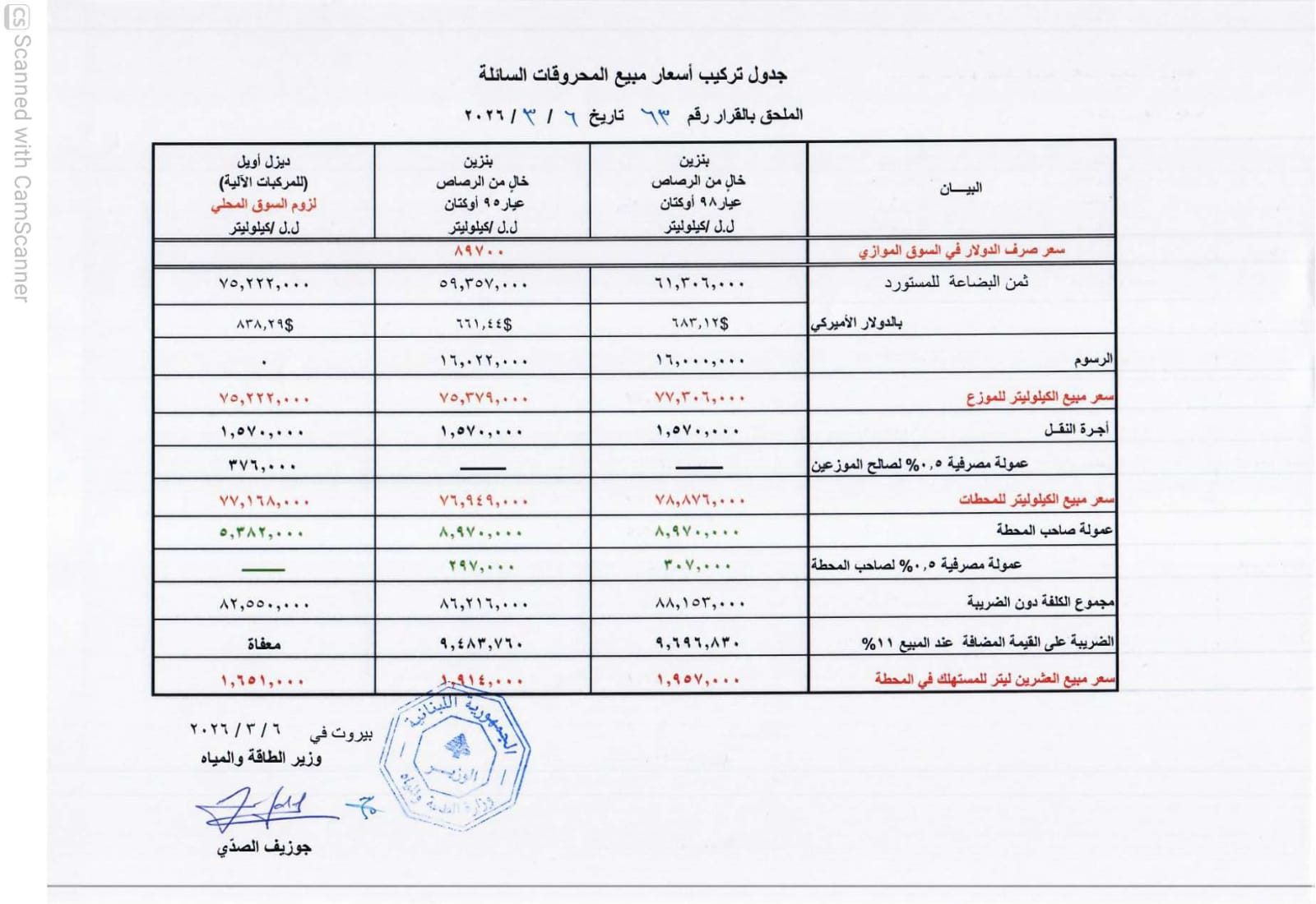 أعلنت وزارة الطاقة والمياه صباح اليوم الجمعة، جدولٌ جديد لأسعار المحروقات، وجاءت الأسعار على الشّكل التالي: