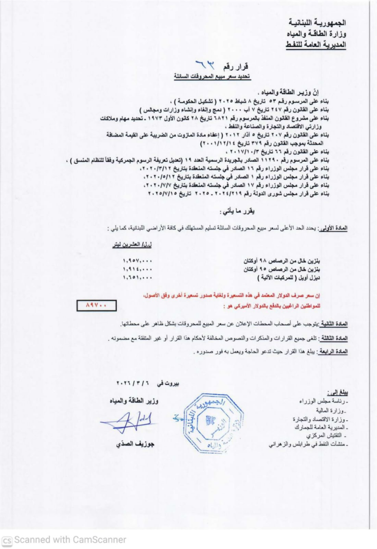 المازوت: 1,651,000 ليرة لبنانيّة. (+19000)