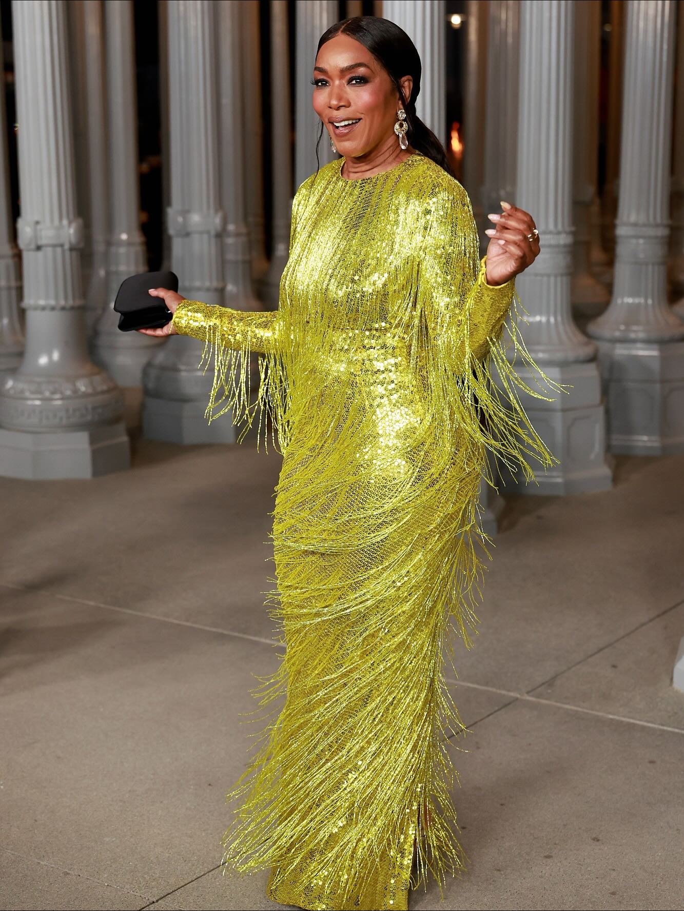 الممثلة أنجيلا باسيت ارتدت فستاناً ماكسي بكُمّين طويلين باللون الأخضر الفستقيّ، مطرّزاً بالكامل بالترتر من اللون نفسه، ومزيّناً بشراشيب من الخرز البرّاق. إطلالة تُجسّد التوازن بين الفخامة والجرأة، وتؤكد أن الأسلوب لا يرتبط بالعمر بل بالحضور والثقة. كذلك، تزيّنت بمجوهرات مرصّعة بالألماس من (David Webb).