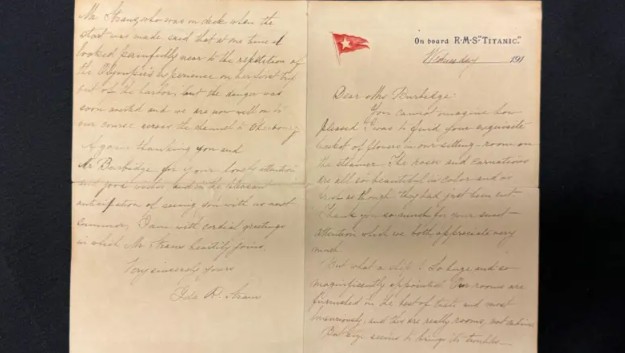 الساعة كانت هدية من إيدا لزوجها عام 1888، وتحمل نقشاً بأحرف اسمه الأولى. وستُباع إلى جانب رسالة نادرة كتبتها إيدا على متن تيتانيك، وصفت فيها رفاهية الرحلة قائلة: “يا لها من سفينة! ضخمة وفاخرة للغاية. غرفنا مفروشة بأفضل الأذواق وأكثرها فخامة”. وتحمل الرسالة ختم البريد “ترانس أتلانتيك 7”، ما يشير إلى أنها أُرسلت من مكتب البريد على متن السفينة.