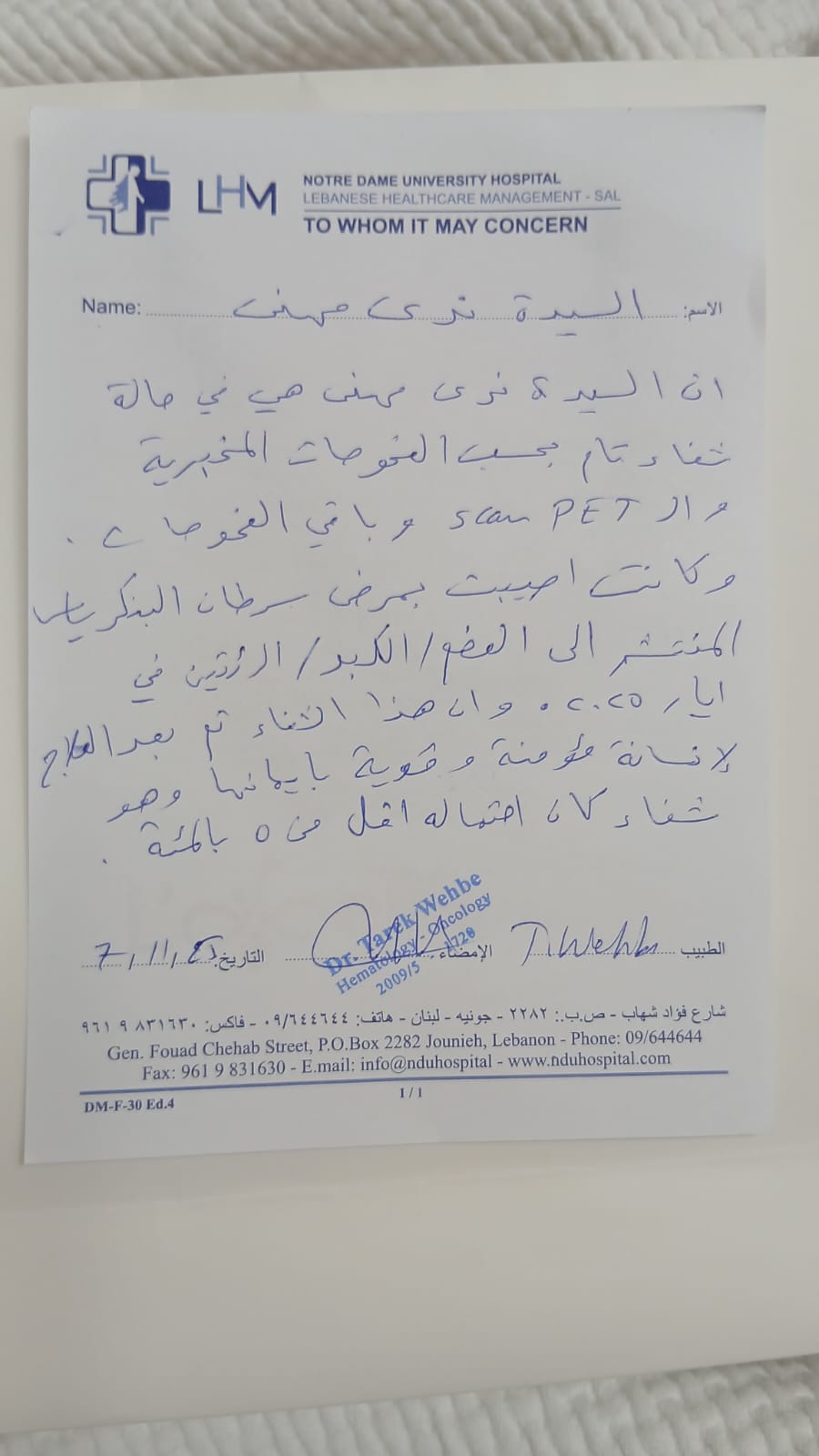 الطبيب طارق وهبه، الذي تابع حالتها، رأى في حلمه أنّ هاتفه رنّ، وصوت قال له إنّ المريضة التي فحصتها حصلت معها أعجوبة وشفيت، وبعدها جاءت النتائج لتؤكد الشفاء الكامل.