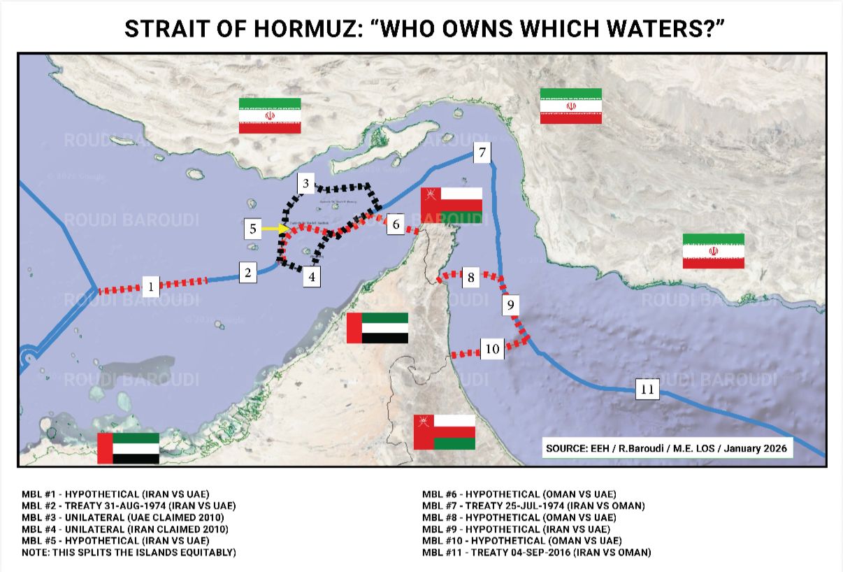 وشدّد بارودي على الأهمية الاستراتيجية لمضيق هرمز، كونه يخدم جميع دول الخليج التي يبلغ عدد سكانها مجتمعةً ما يقارب 200 مليون نسمة. وعلى الرغم من وجود حدود بحرية بين إيران والإمارات وسلطنة عُمان، فقد تمّ توقيع اتفاقيّات لترسيم الحدود البحرية عام 1974 وأخرى عام 2016. إضافةً إلى ذلك، هناك جزيرتان صغيرتان تعود ملكيتهما إلى دولة الإمارات العربية المتحدة، إلّا أنهما خاضعتان حاليًا لسيطرة إيران.