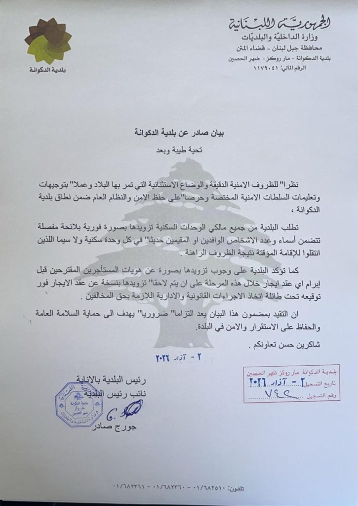 علم موقع “هنا لبنان” أنّ بعض البلديات في جبل لبنان لا سيما في المتن ومنها بلدية الدكوانة تقوم بتسيير سياراتٍ لشرطة البلدية بين الأحياء تنادي من خلالها أصحاب الأبنية والشقق بضرورة الإفصاح والإبلاغ عن وجود مستأجرين أو نازحين جدد، وإلّا فإنّ ذلك سيؤدّي إلى اتخاذ إجراءات قانونية بحقّهم، وذلك حرصًا على سلامة أهالي المنطقة من إمكان تواجد أشخاص مخلّين بالأمن لا سيما من الحزب في ظلّ النّزوح الحاصل من الجنوب والضاحية.