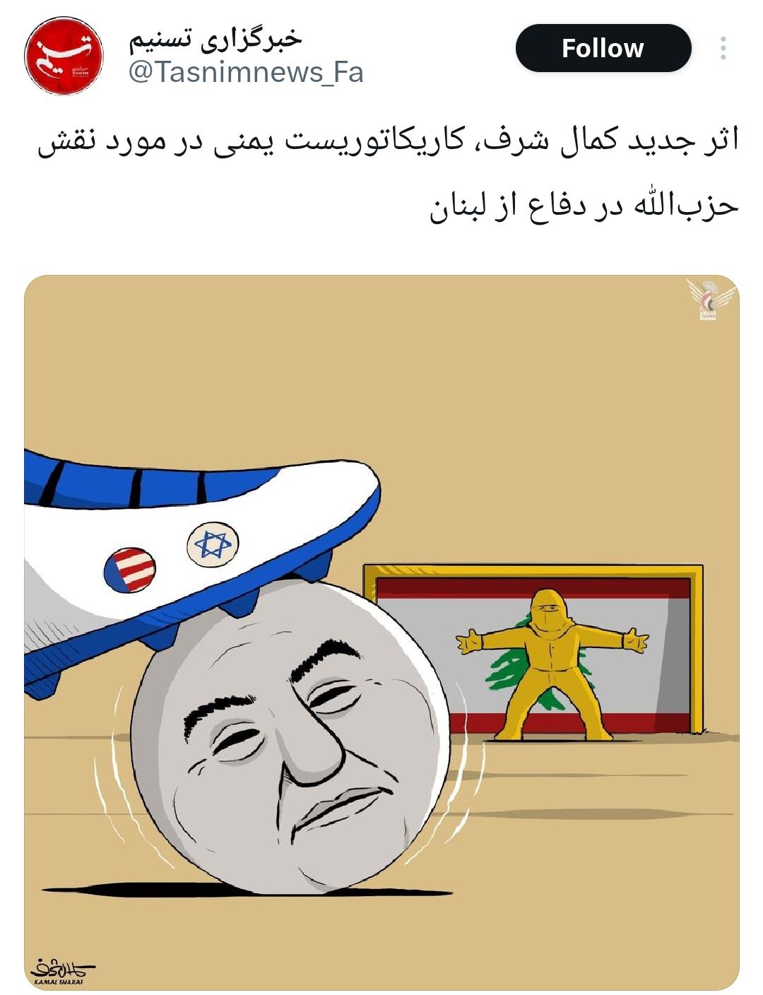 وفي جديد فصول السقوط الإيراني، نشرت وكالة تسنيم الإيرانية، وهي وكالة شبه رسمية ويعتدّ بها في إيران، رسماً كاريكاتيرياً يتعرّض لشخص الرئيس عون.