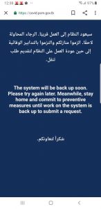 وعبر موقع المنصة كُتب الإعلان التالي: “سيعود النظام إلى العمل قريبًا. الرجاء المحاولة لاحقًا. الزموا منازلكم والتزموا بالتدابير الوقائية إلى حين عودة العمل على النظام لتقديم طلب تنقل”.