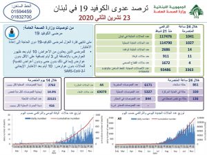 أعلنت وزارة الصحّة تسجيل 11 وفاة و1041 إصابة جديدة بفيروس “كورونا” في لبنان، ليرتفع إجمالي الوفيات في لبنان الى 911، والاصابات الى 117476.