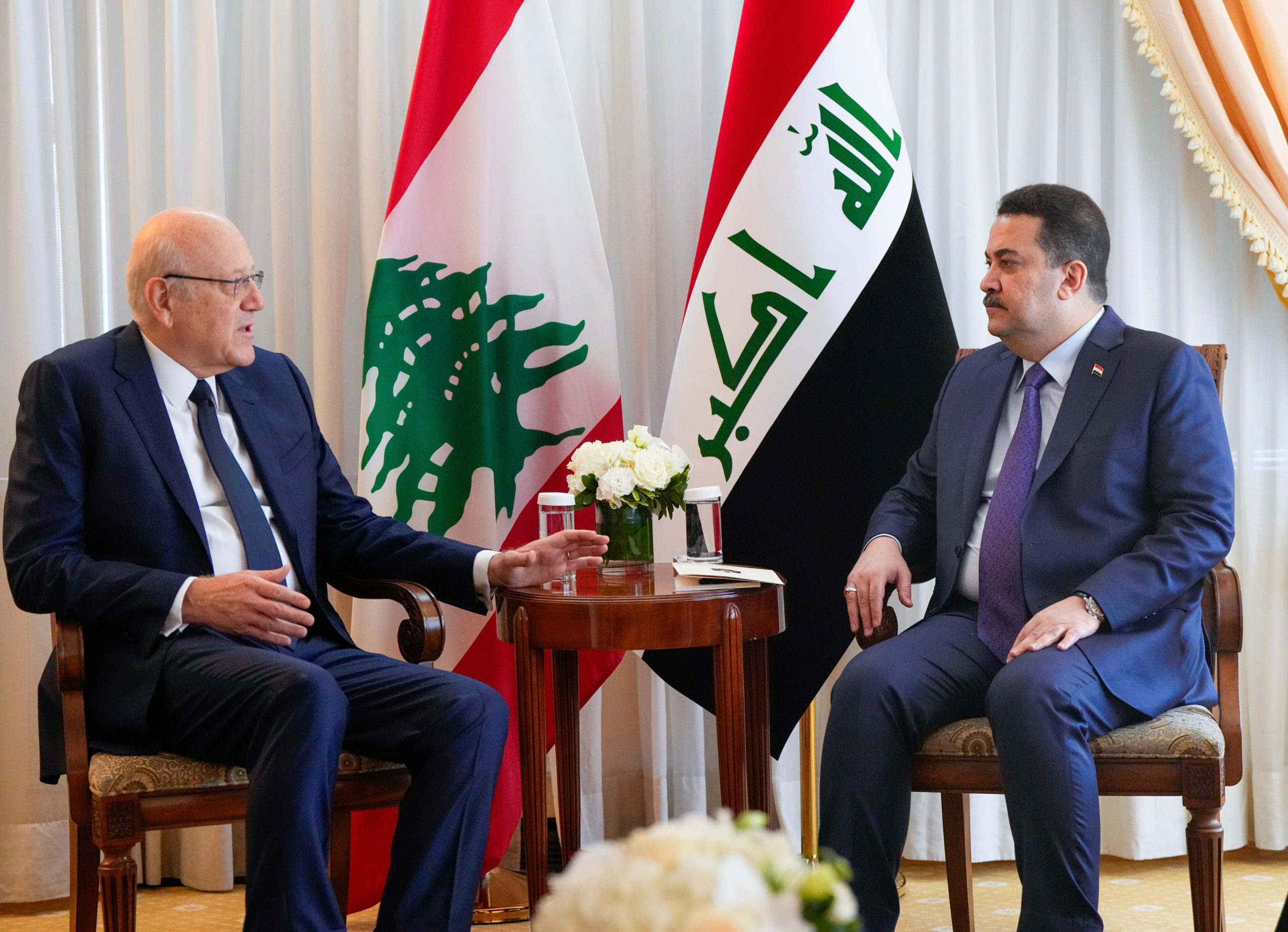 والتقى رئيس الحكومة رئيس وزراء العراق محمد شياع السوداني، مشيداً بجهود العراق في الدعوة لعقد قمة عربية وإسلامية من أجل وقف العدوان الاسرائيلي عن لبنان وأهله، ومنع انتشار الصراع في المنطقة.