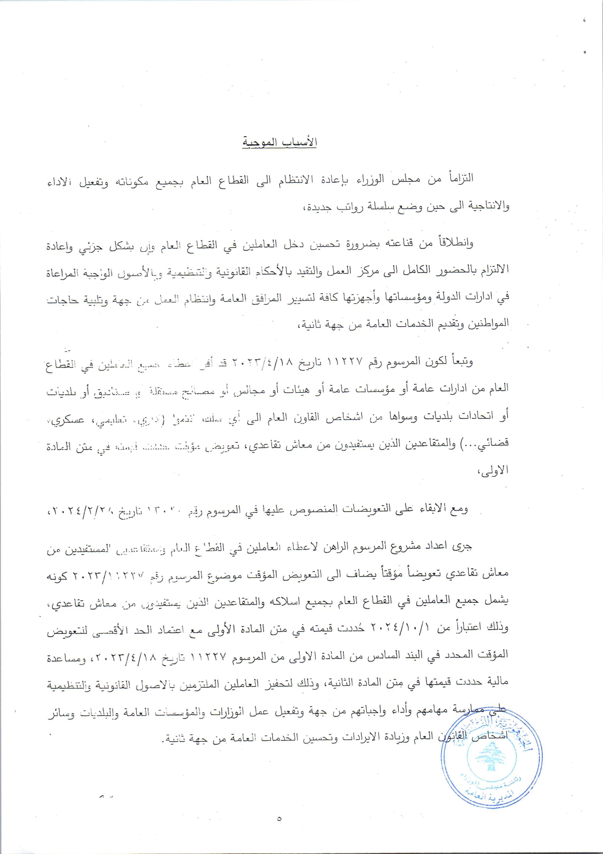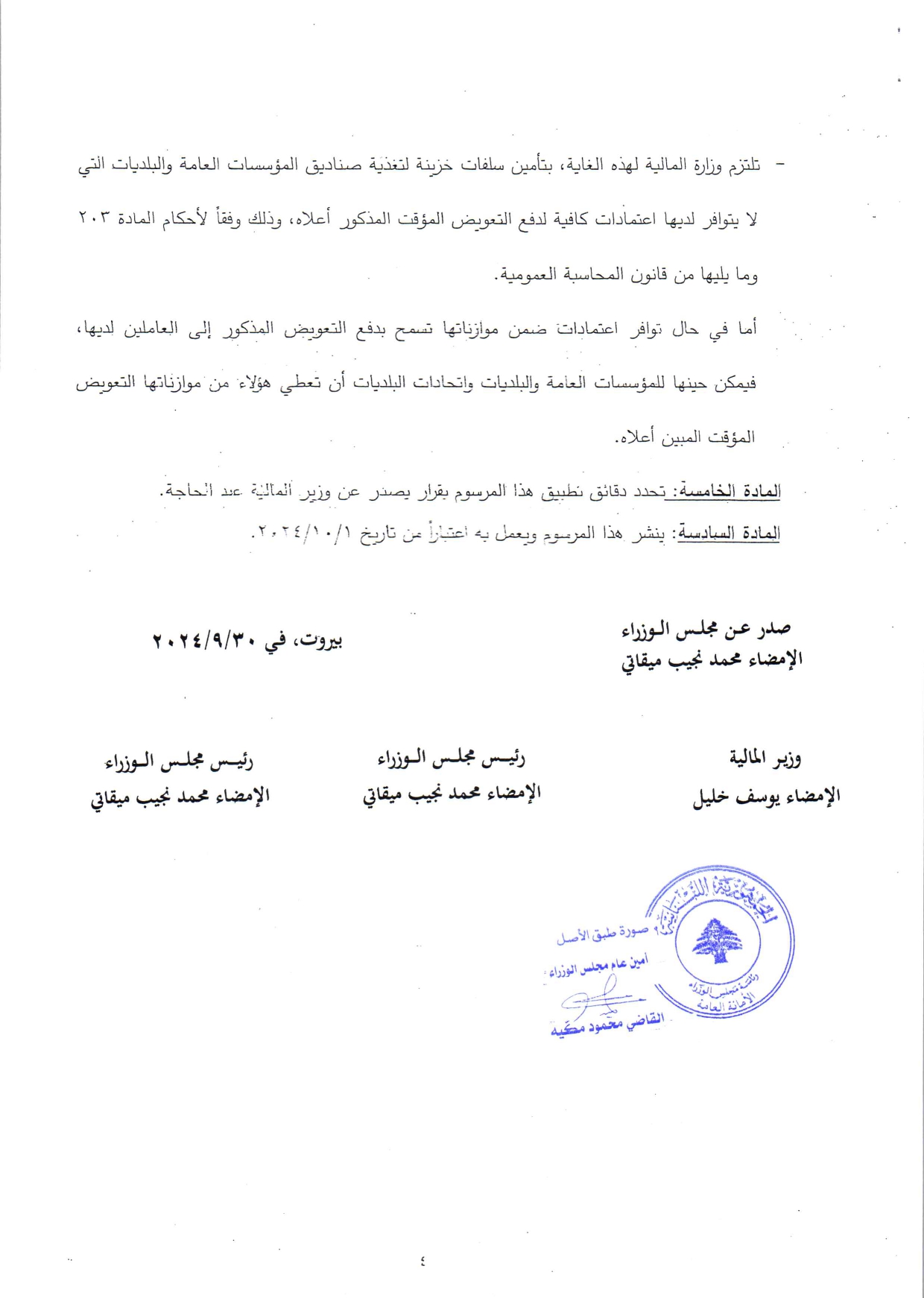 أصدر رئيس حكومة تصريف الأعمال نجيب ميقاتي مرسومًا بِإعطاء تعويض مؤقت ومساعدة مالية لجميع العاملين في القطاع العام والمتقاعدين الذين يستفيدون من معاش تقاعدي.