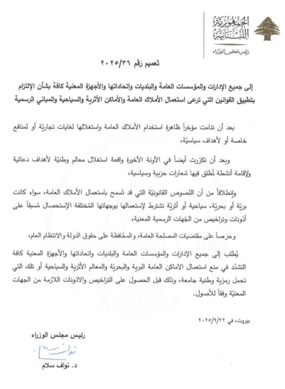 أصدر رئيس مجلس الوزراء نواف سلام تعميماً إلى كل الإدارات والمؤسسات العامة والبلديات واتحاداتها والأجهزة المعنية كافة بشأن الالتزام بتطبيق القوانين التي ترعى استعمال الأملاك العامة البرية والبحرية والأماكن الأثرية والسياحية والمباني الرسمية والمعالم التي تحمل رمزية وطنية جامعة.