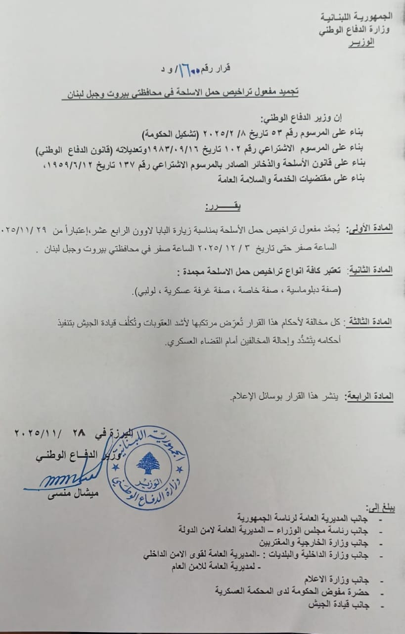 المادة الأولى: يُجمَّد مفعول تراخيص حمل الأسلحة بمناسبة زيارة البابا لاوون الرابع عشر، إعتباراً من 29/11/2025 الساعة صفر حتى تاريخ 3/12/2025 الساعة صفر في محافظتي بيروت وجبل لبنان.