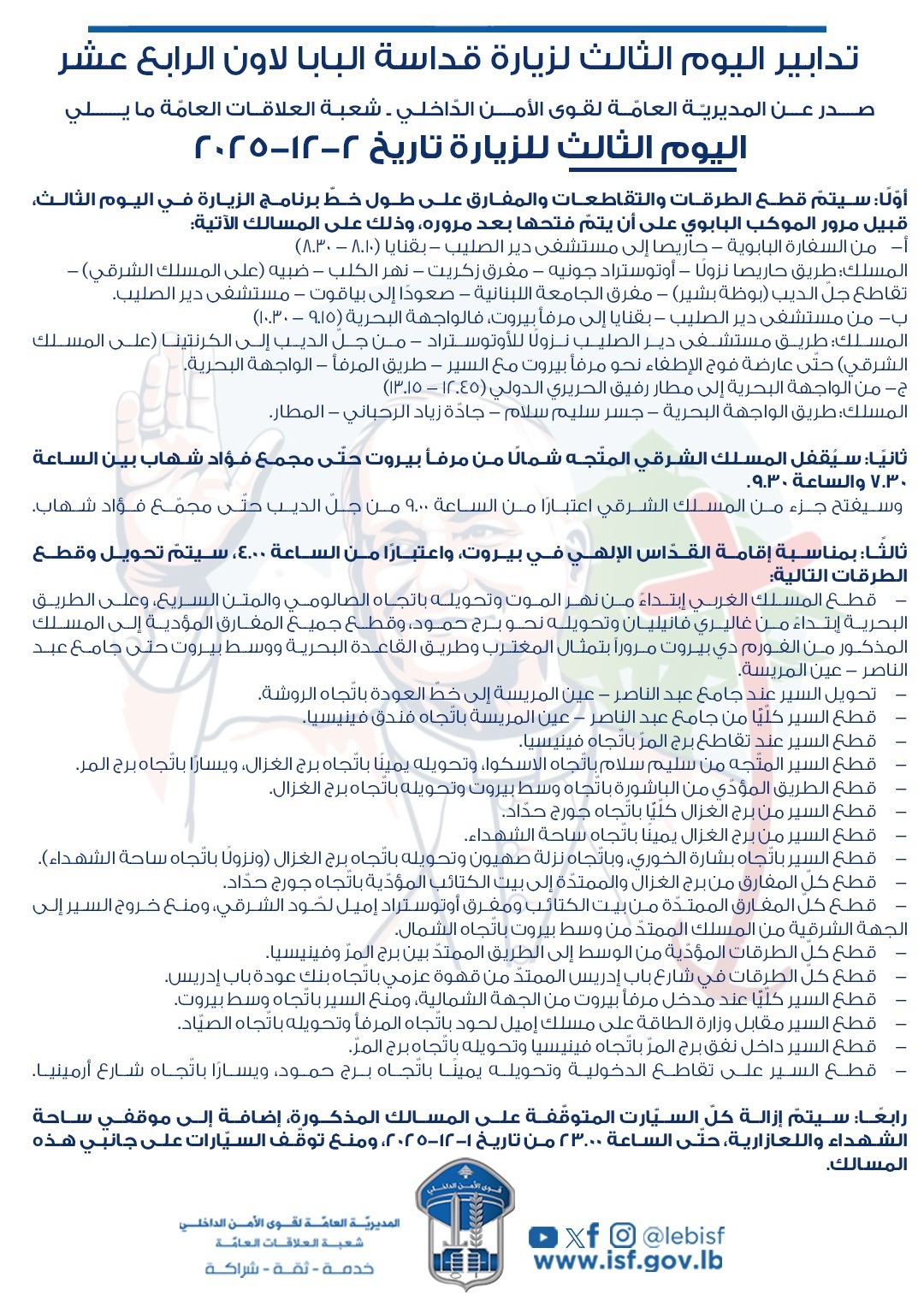 ذكرت المديرية العامّة لقوى الأمن الدّاخلي ـ شعبـة العلاقات العامّة، بتدابير سير اليوم الثالث لزيارة قداسة البابا لاون الرابع عشر لبنان بتاريخ 2-12-2025.
