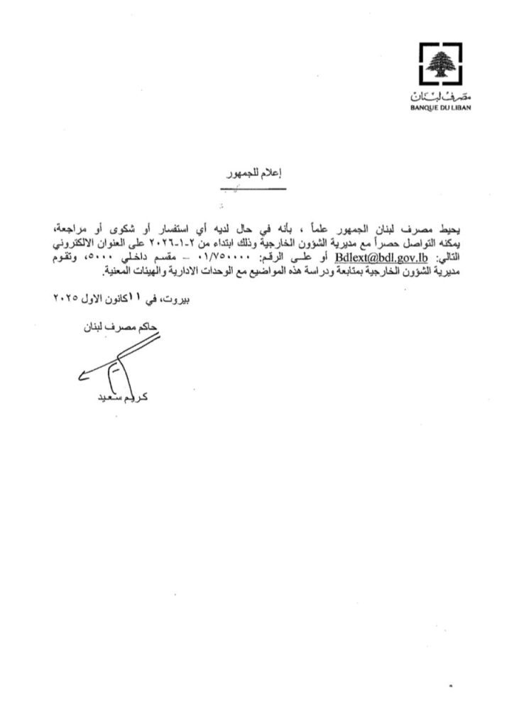 صدر عن مصرف لبنان تعميمان، جاء في الأول: يحيط مصرف لبنان الجمهور علمًا بأنه، ابتداءً من 2026-01-02، يمكن لأي شخص لديه استفسار أو شكوى أو مراجعة أن يتواصل حصراً مع مديرية الشؤون الخارجية على البريد الإلكتروني التالي: [email protected] أو على الرقم: 01/750000 – مقسم داخلي 5000، على أن تقوم مديرية الشؤون الخارجية بمتابعة هذه المواضيع ودراستها مع الوحدات الإدارية والهيئات المعنية.