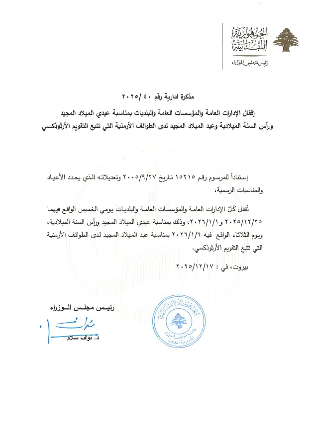 أصدرت رئاسة مجلس الوزراء مذكرة تنص على إقفال الإدارات والمؤسسات العامة والبلديات بمناسبة عيدي الميلاد المجيد ورأس السنة الميلادية وعيد الميلاد المجيد لدى الطوائف الأرمنية.