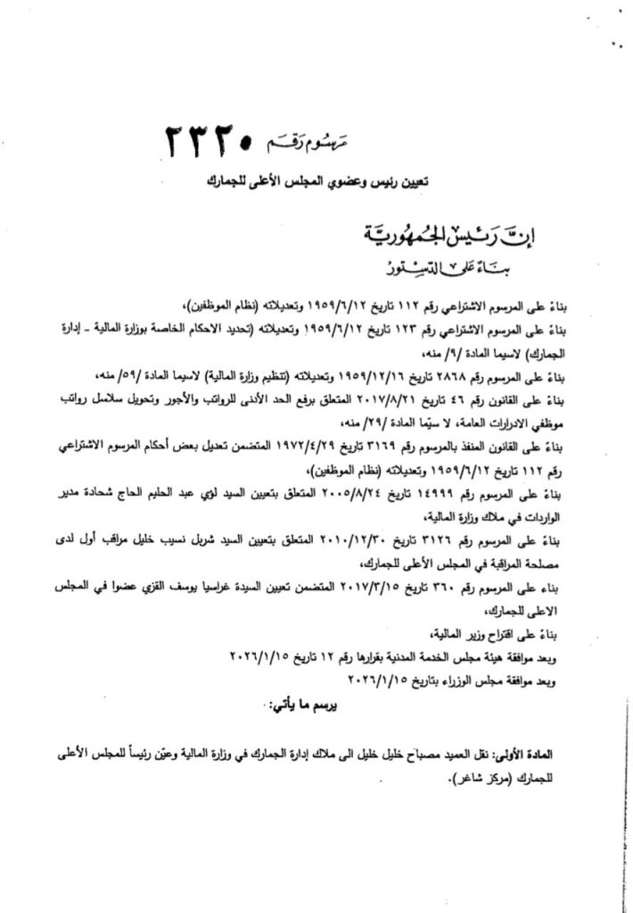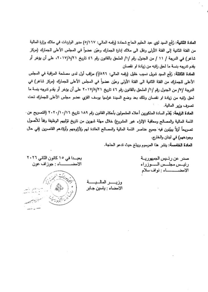 تمّ تعيين العميد مصباح خليل رئيسًا للمجلس الأعلى للجمارك، وشربل خليل ولؤاي الحاج شحادة عضوين في المجلس، وغراسيا القزي مديرًا عامًا.