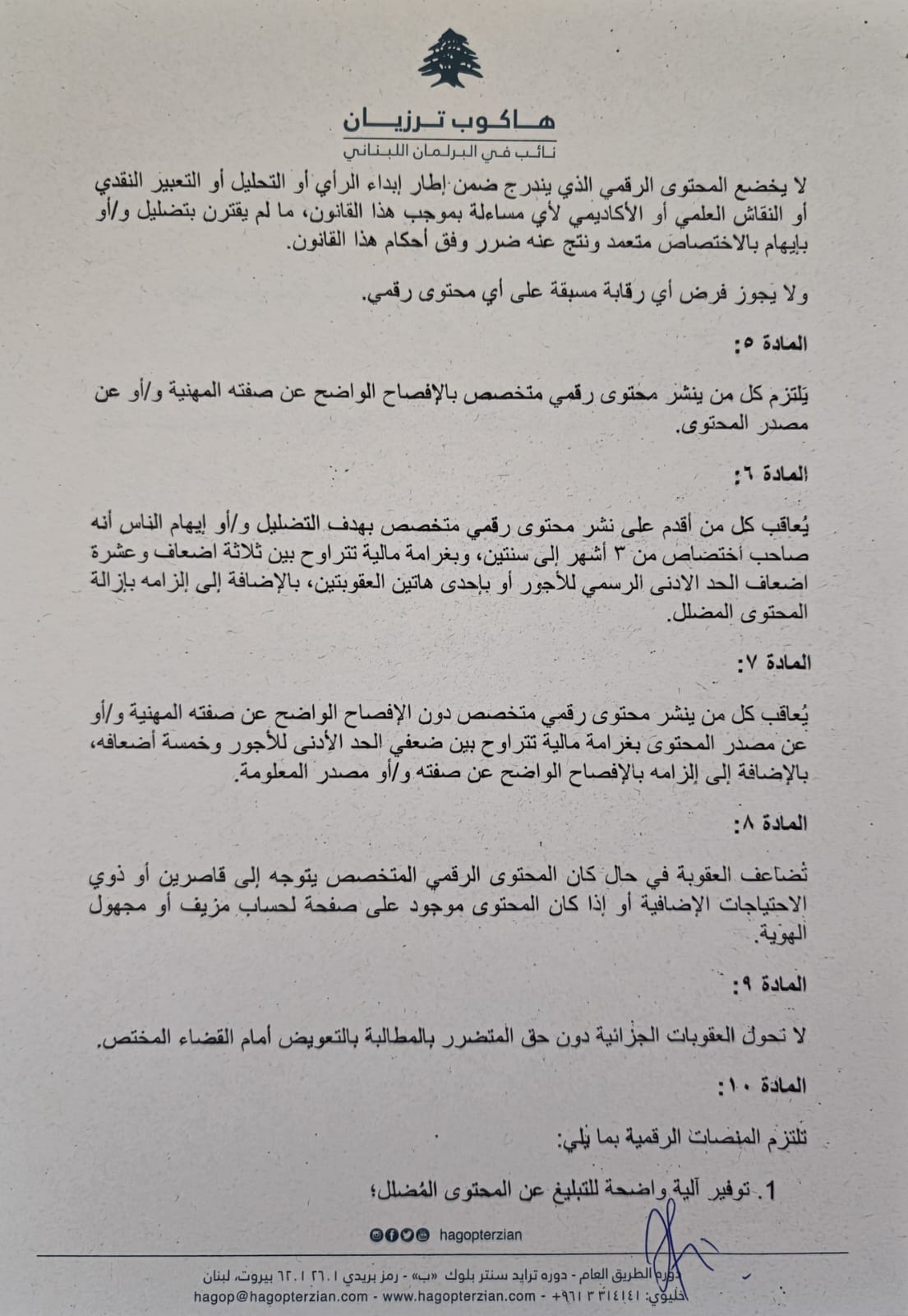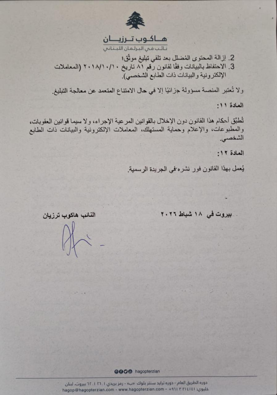 لذلك، تقدّمتُ باقتراح قانون يهدف إلى تنظيم نشر المحتوى الرقمي المتخصص، من خلال إرساء مبدأ الشفافية والإفصاح عن الصفة المهنية ومصدرها، وتحديد المسؤولية القانونية المترتبة على إساءة استعمال هذا النوع من المحتوى، دون المساس بجوهر حرية الرأي والتعبير، وبما ينسجم مع الدستور اللبناني، ولا سيّما المبادئ المتعلقة بالحريات العامة، ومع الالتزامات الدولية التي تعهّد بها لبنان في مجال حقوق الإنسان.