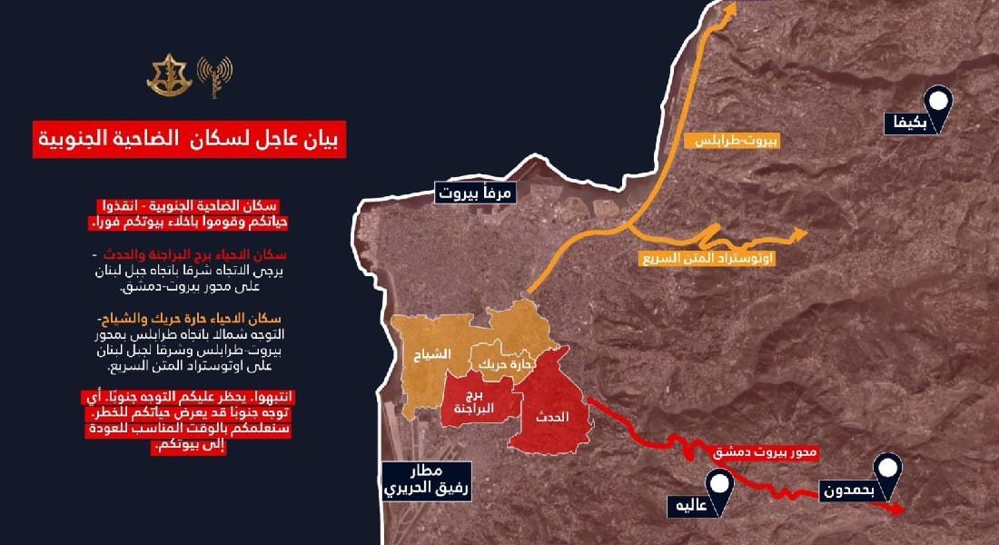أصدر الجيش الإسرائيلي انذاراً عاجلاً إلى سكان الضاحية الجنوبية في بيروت وتحديدًا لمن لم يخلي المنطقة بعد.