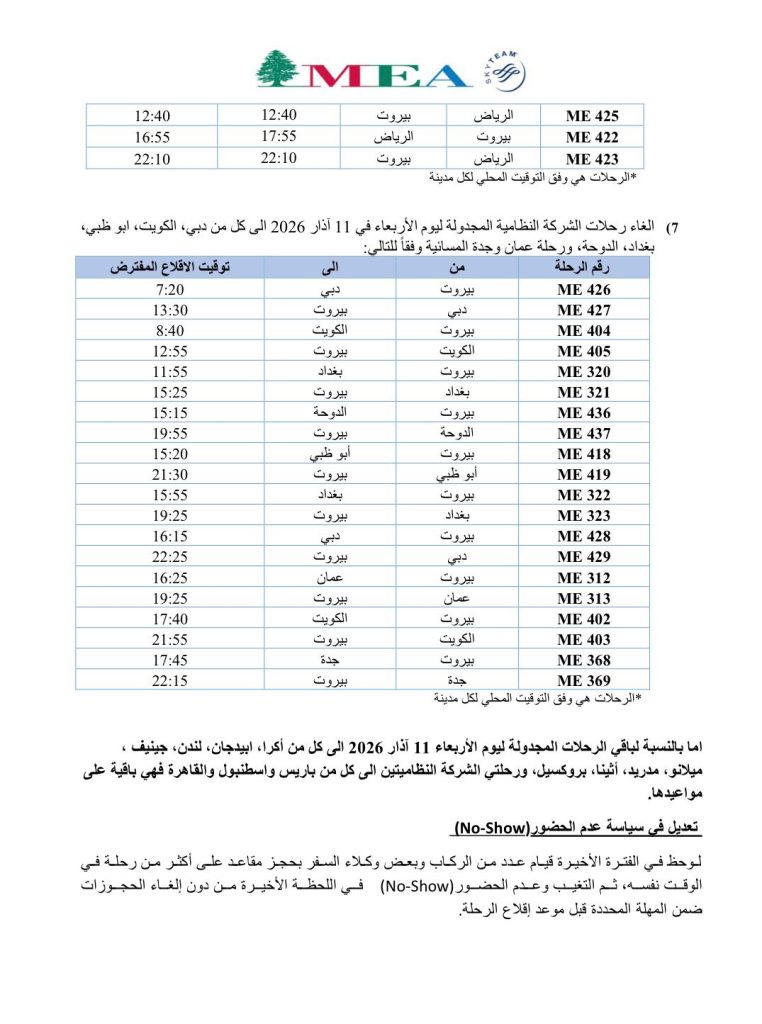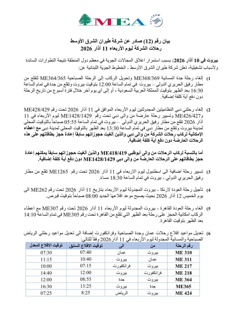 أعلنت شركة طيران الشرق الأوسط في بيان مواعيد رحلات الشركة ليوم الأربعاء 11 آذار 2026.