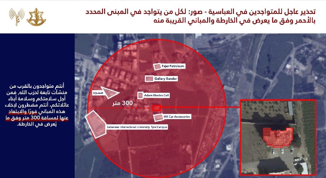 وتابع في الإنذار قائلًا: “جيش الدفاع يعود ويكرر ان أنشطة حزب الله الإرهابي تجبر جيش الدفاع على العمل ضده وبقوة. جيش الدفاع لا ينوي المساس بكم. حرصًا على سلامتكم نحثكم على الاخلاء فورًا وعدم العودة إلى هذه الأحياء حتى اشعار آخر. جيش الدفاع لن يتردد باستهداف كل من يتواجد بالقرب من عناصر حزب الله او منشآته او وسائله القتالية. أنتم تعرضون أنفسكم وحياتكم للخطر – لذلك أخلوا المنطقة فورًا.”