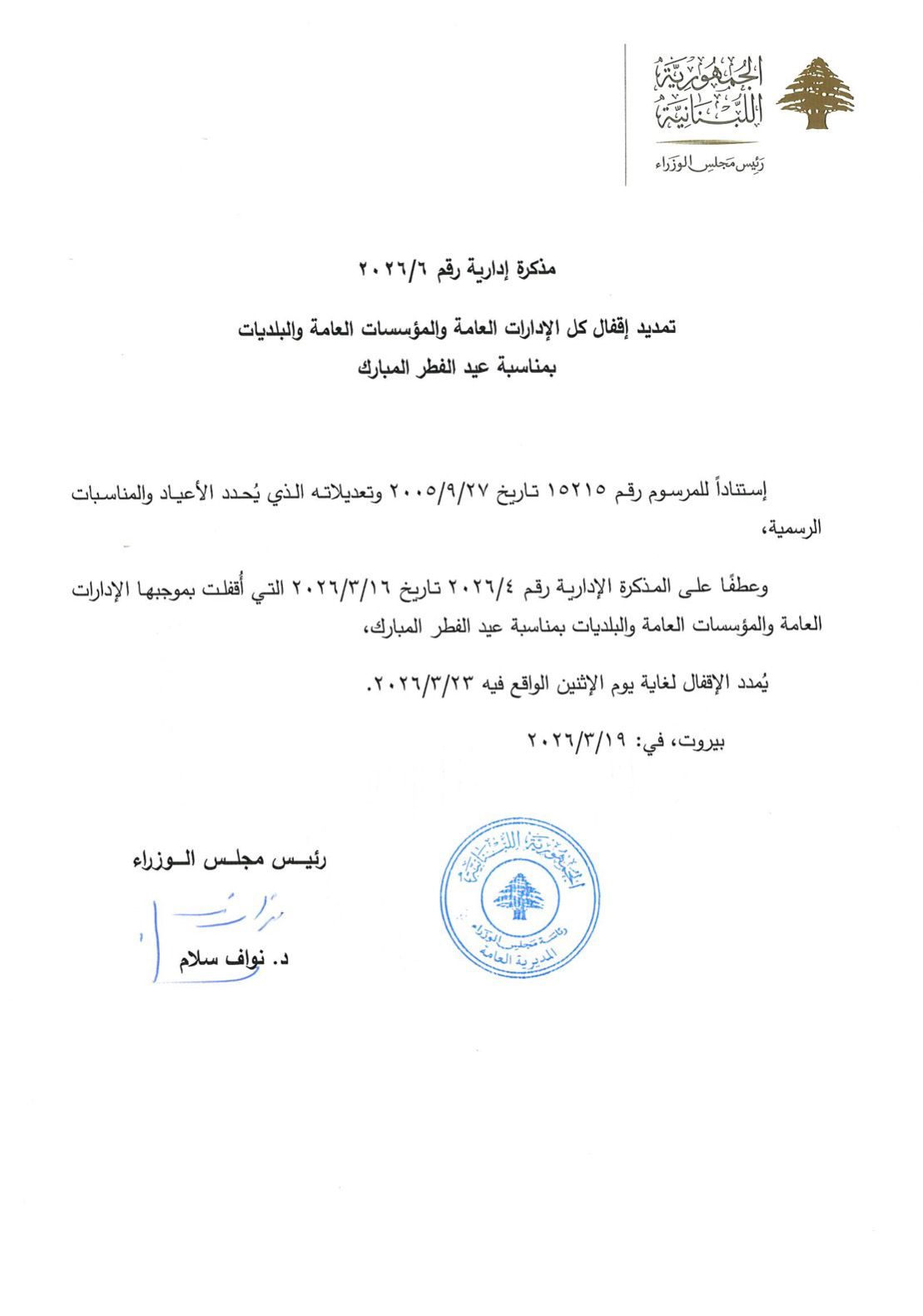 صدرت مذكرة حكومية تقضي بتمديد عطلة عيد الفطر حتى يوم الاثنين المقبل ضمناً، وذلك في إطار تنظيم الدوام الرسمي خلال فترة العيد.