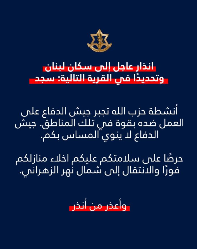 أنذر المتحدث باسم الجيش الإسرائيلي أفيخاي أدرعي سكان لبنان وتحديدًا سكان قرية سجد في جنوب لبنان.
