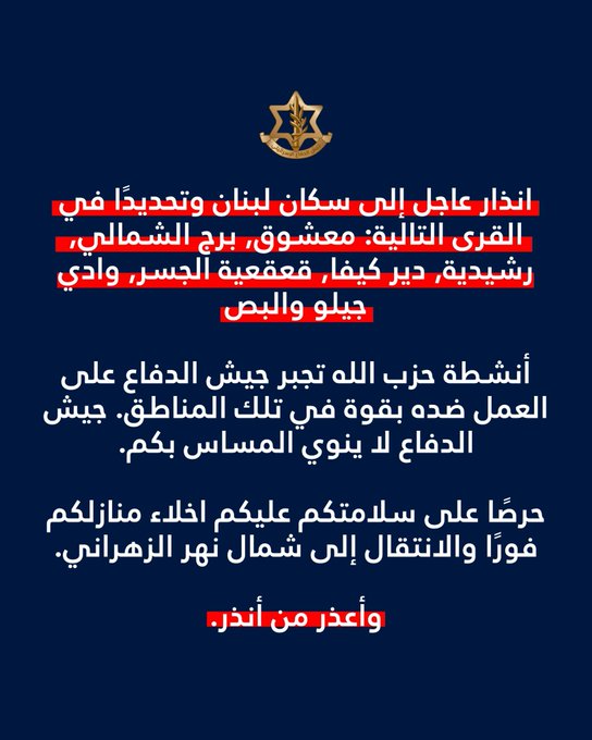 وجّه المتحدث باسم الجيش الإسرائيلي إنذارًا عاجلًا إلى سكان لبنان. وجاء في منشوره على “أكس”: إنذار إلى القرى التالية: معشوق برج الشمالي الرشيدية دير كيفا قعقعية الجسر وادي جيلو البص.