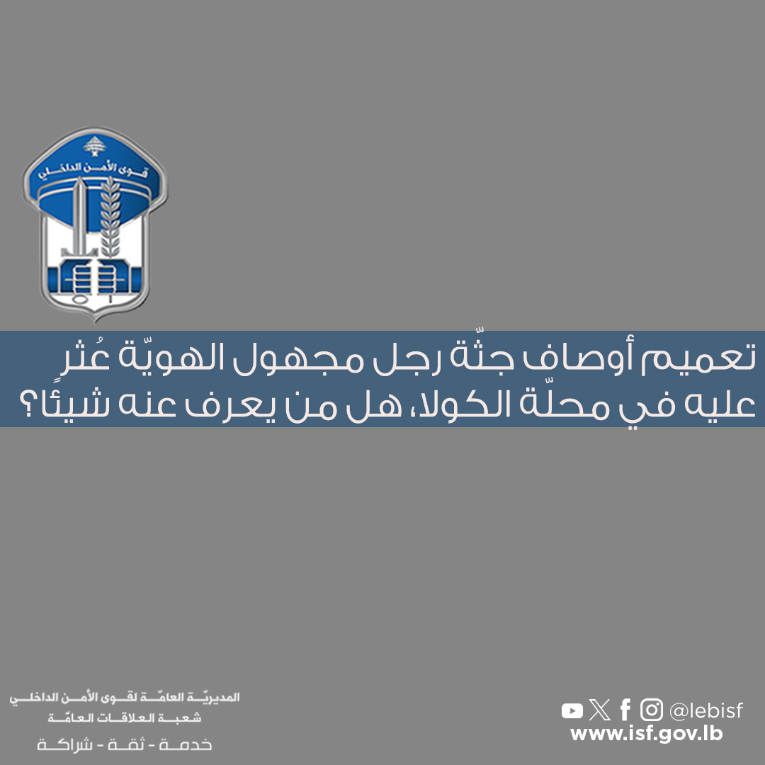لذلك وبناءً على إشارة القضاء المختص، تطلب المديريّة العامّة لقوى الأمن الدّاخلي من ذويه أو مِمَّن يعرف عنه شيئًا، الاتصال بفصيلة الرّملة البيضاء في وحدة شرطة بيروت على الرقم: 790714-01، لاتّخاذ الإجراءات القانونية اللّازمة، تمهيدًا لاستلام الجثّة.