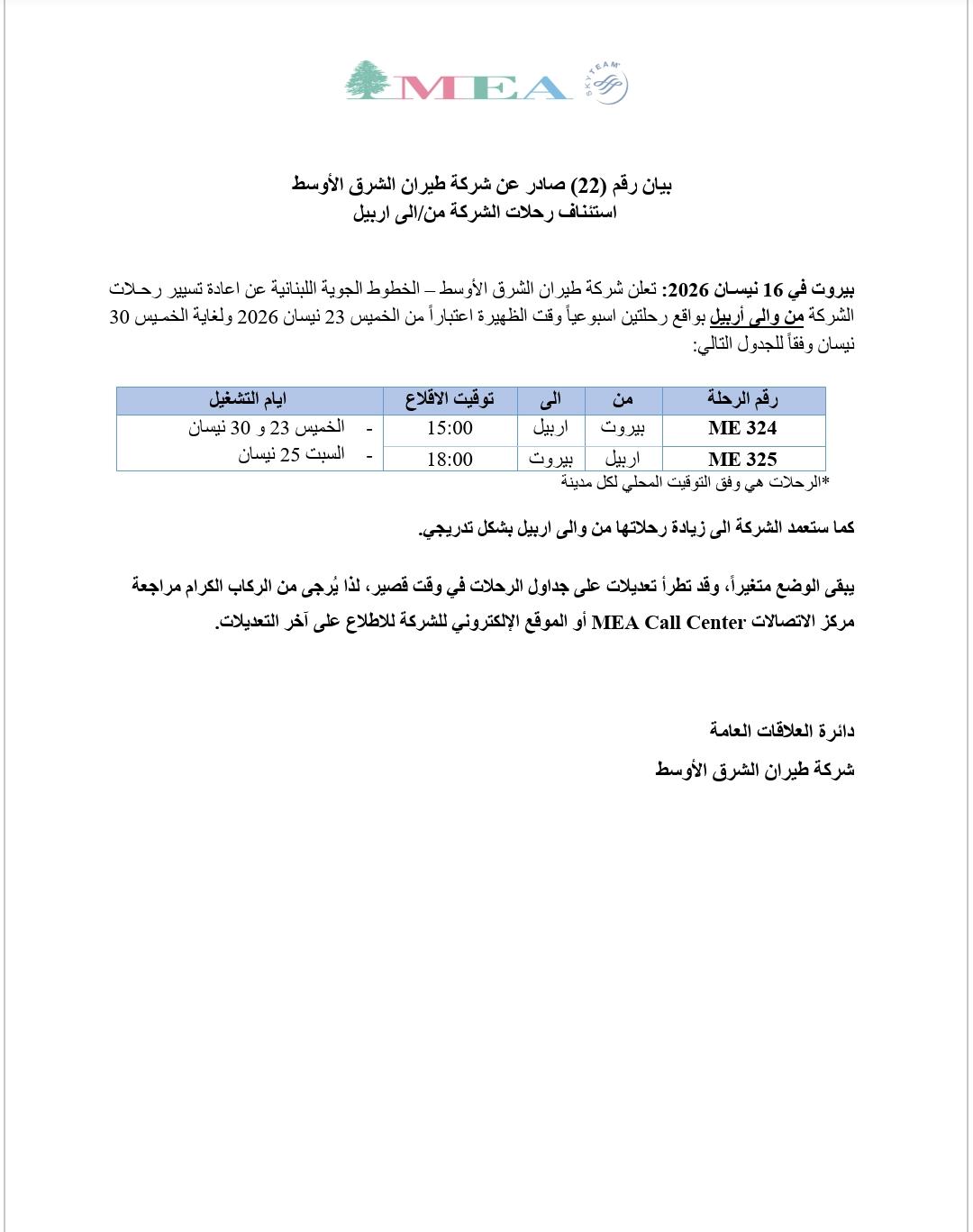 أعلنت شركة طيران الشرق الأوسط – الخطوط الجوية اللبنانية في بيان “اعادة تسيير رحلات الشركة من والى أربيل بواقع رحلتين اسبوعياً وقت الظهيرة اعتباراً من الخميس 23 نيسان 2026 ولغاية الخميس 30 نيسان”.