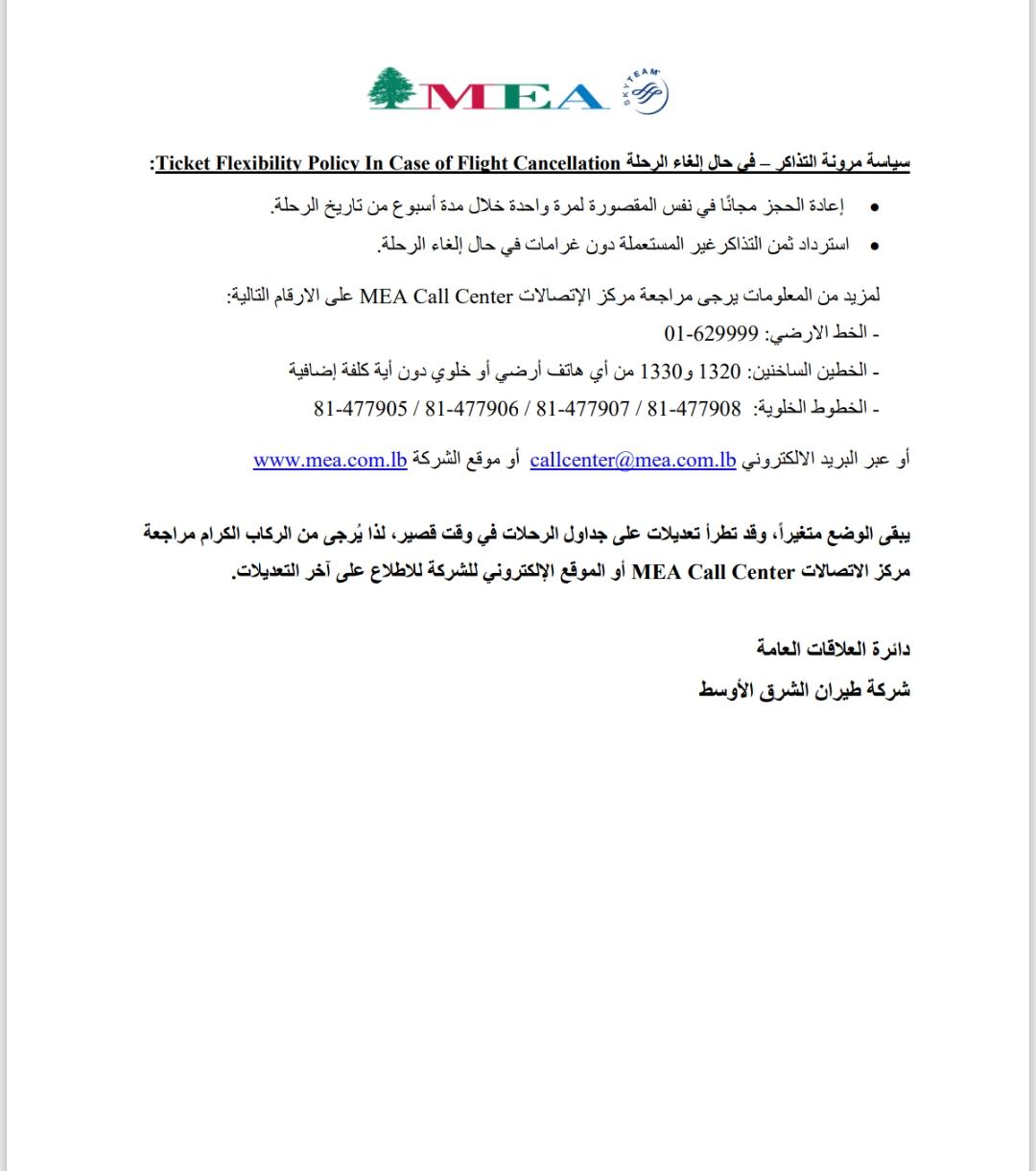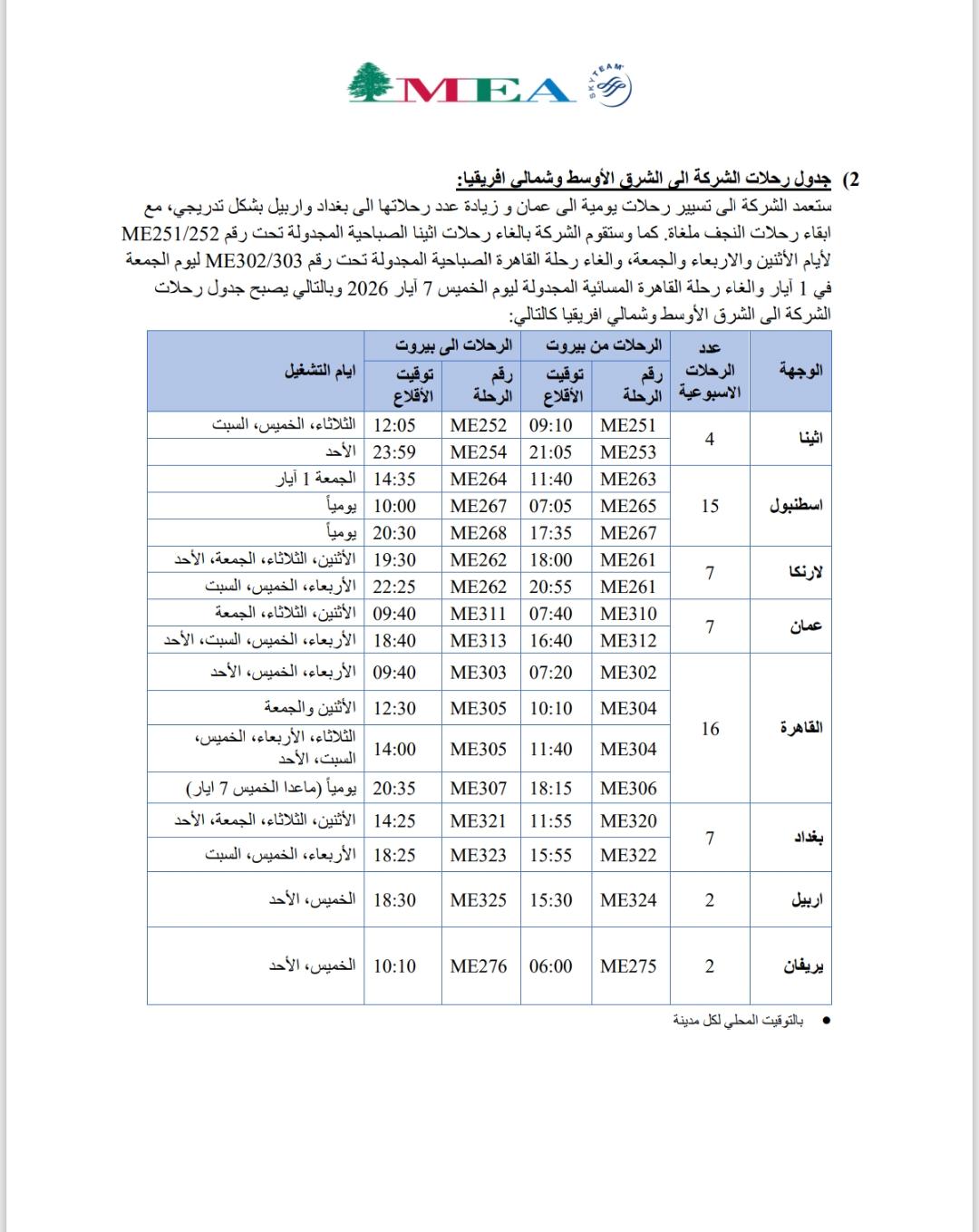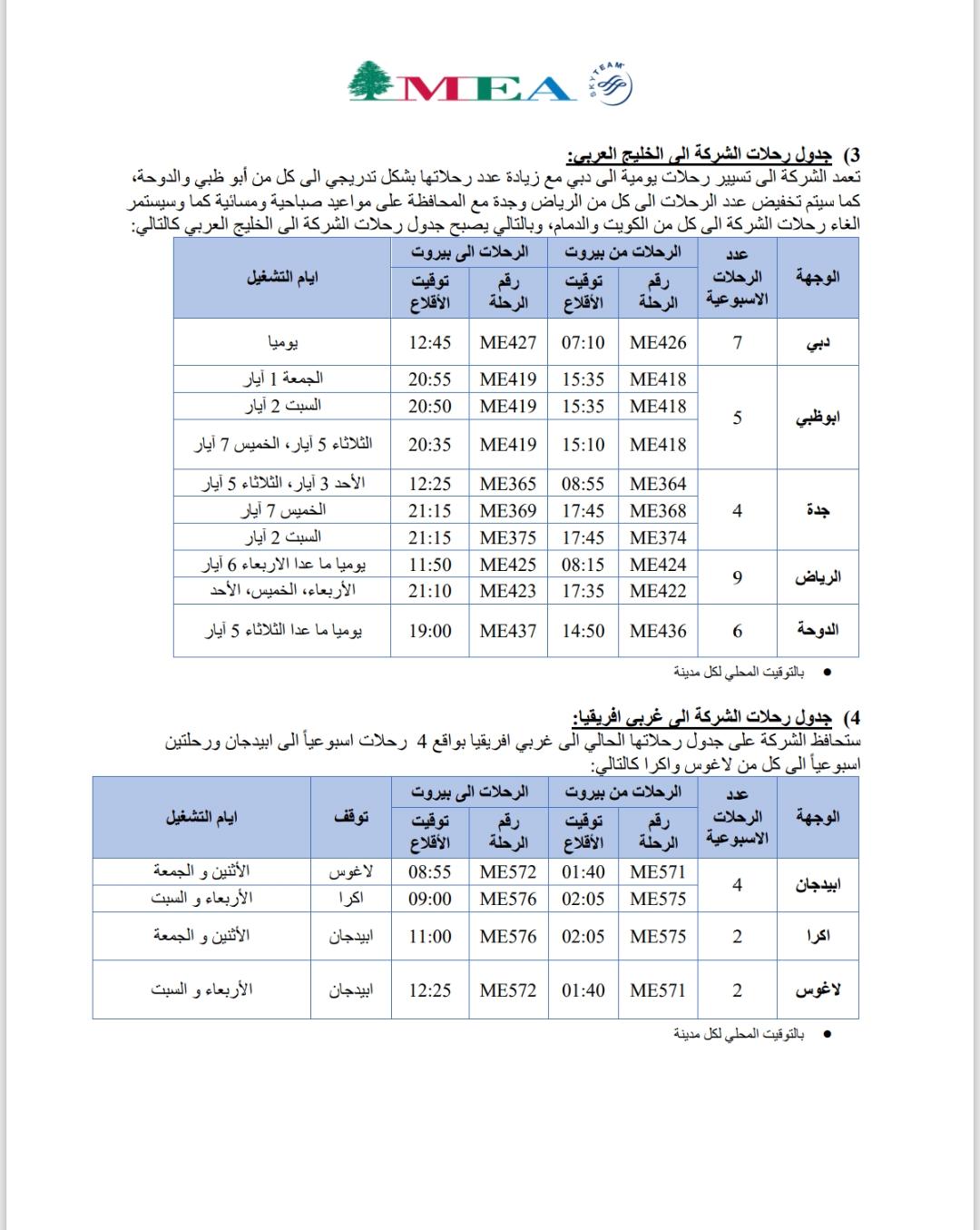 وستعمد الشركة الى “تسيير رحلات بشكل منتظم الى معظم وجهاتها في اوروبا وافريقيا والشرق الأوسط والخليج العربي مع استمرار تعليق رحلات الشركة الى الدمام و الكويت والنجف وتعليق رحلات دبي والدوحة المسائية والليلية المجدولة تحت رقم ME428/429 و ME434/435 وبالتالي يصبح جدول مواعيد الشركة كالتالي: