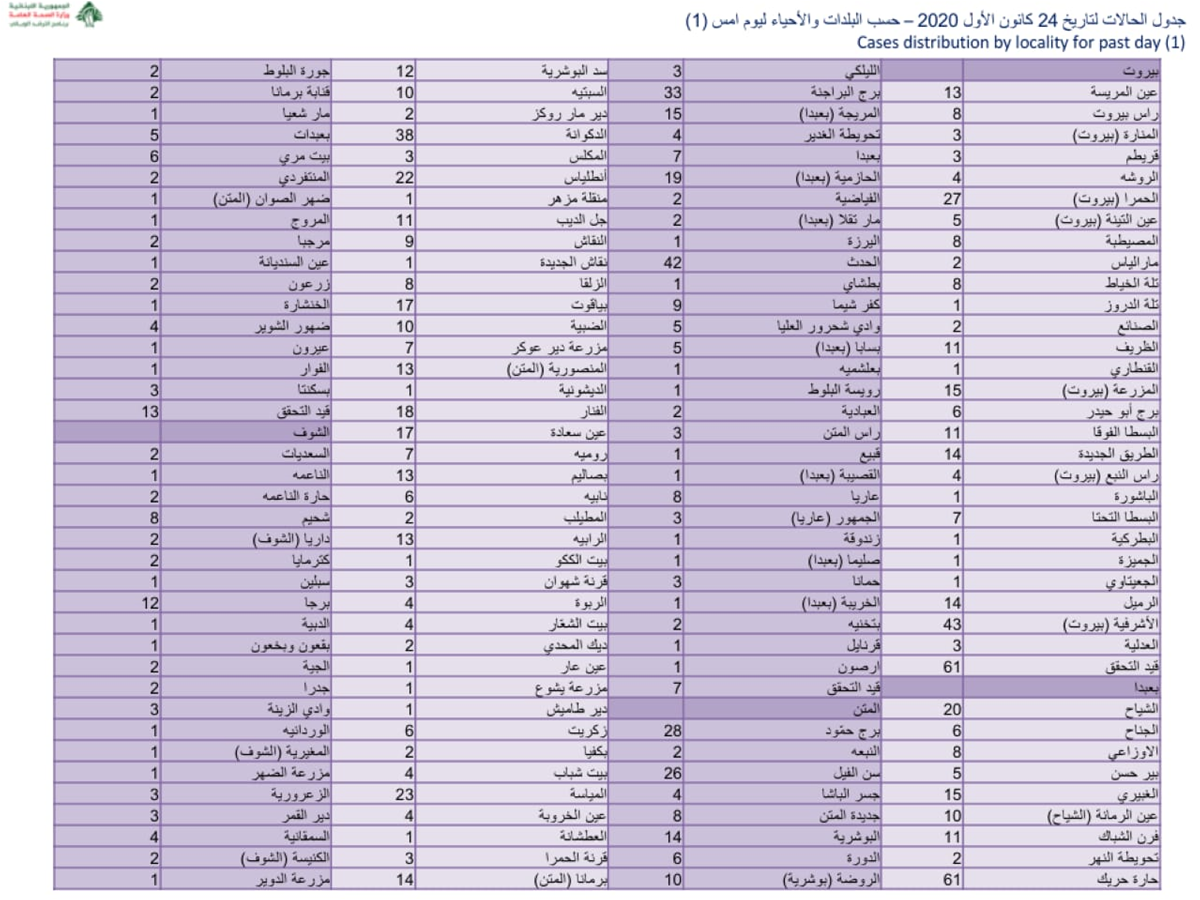 نشرت وزارة الصحة العامة جداول حول توزع إصابات فيروس “كورونا” في المناطق، وهي على النحو التالي: