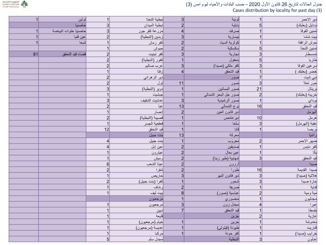 نشرت وزارة الصحة العامة جدول توزيع الإصابات الجديدة بكورونا في الساعات الـ24 الماضية على القرى والمناطق اللبنانية.