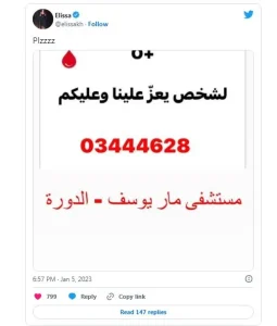 وقالت إليسا في تغريدة عبر حسابها الرسمي على “تويتر”: “عاجل… مطلوب التبرع بالدم فئة o+ لشخص بيعز علينا وعليكم؟. مستشفى مار يوسف – الدورة”. وأرفقت إليسا التغريدة برقم هاتف للتبرع. كذلك قامت الفنانة مايا دياب بنشر الرسالة نفسها عبر “الستوري” المرفقة بحسابها على “إنستغرام”.