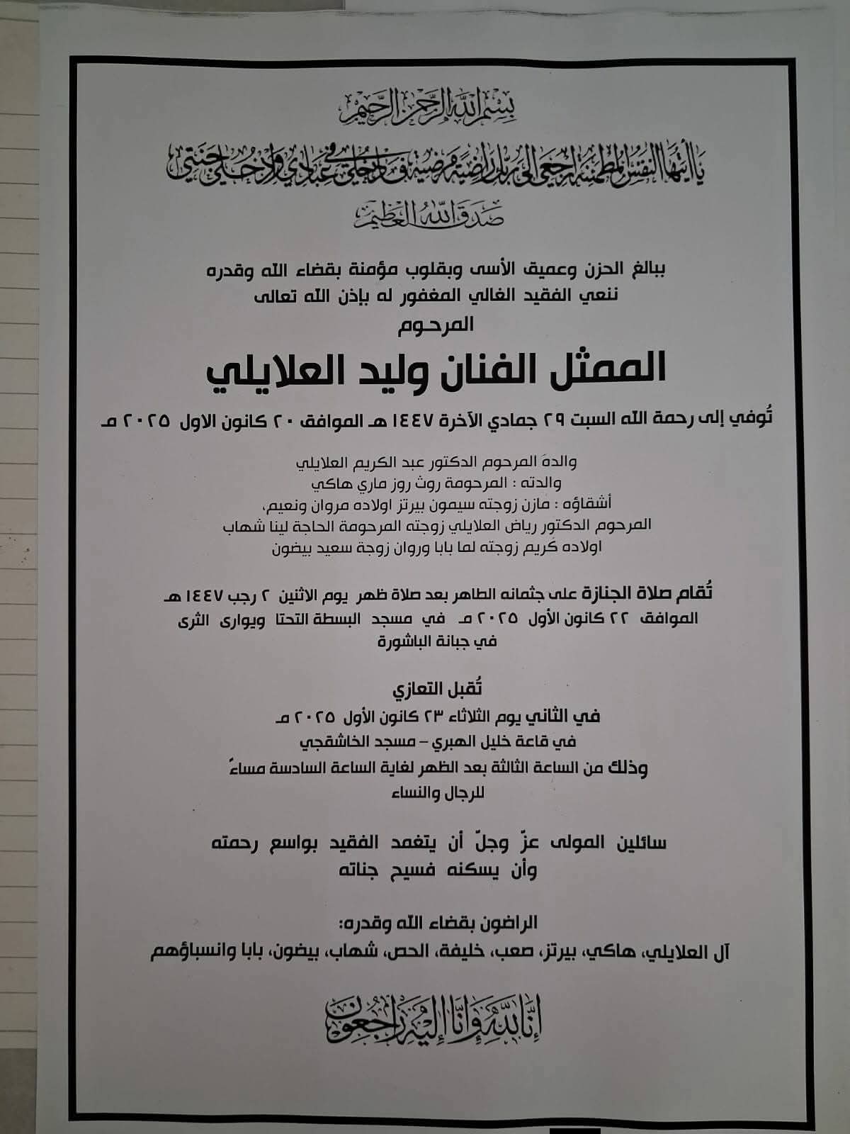 إليكم تفاصيل مراسم الدفن والتعازي بالممثل الراحل وليد العلايلي