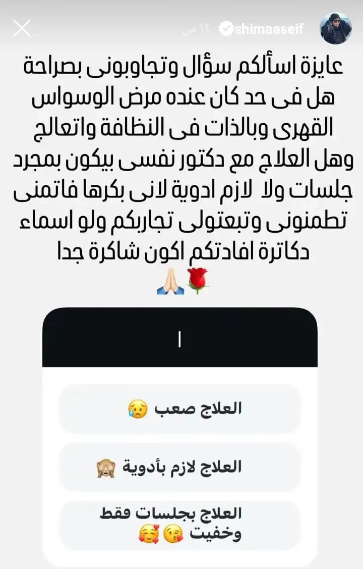 وأبدت شيماء تخوفها من العلاج الدوائي، متسائلة عما إذا كان العلاج النفسي يقتصر على الجلسات فقط أم يستلزم تناول أدوية، مطالبة متابعيها بمشاركتها تجاربهم الشخصية أو ترشيح أطباء ساعدوهم على تجاوز المرض.