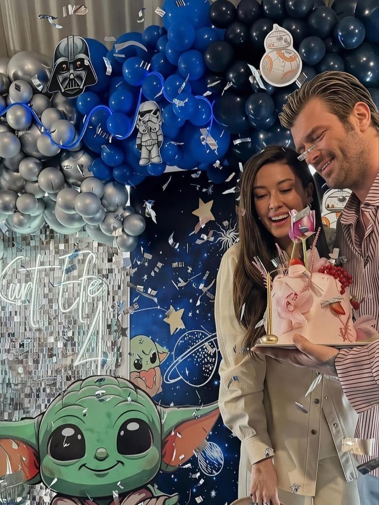 اختار الزوجان طابع سلسلة الأفلام الشهيرة “حرب النجوم” (Star Wars) ليكون السيم الأساسية للحفل. وطغت الألوان الأزرق الداكن والأسود والفضي على الديكورات، التي تزينت بمجسمات لشخصيات السلسلةـ بالإضافة إلى بالونات ضخمة وكعكة عيد ميلاد عملاقة مكونة من عدة طبقات تحمل تفاصيل دقيقة من عالم الفضاء.
