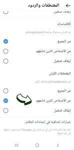 تحت هذه القائمة يمكنك أيضاً اختيار إحدى ثلاثة إعدادات: «من الجميع»، «من الأشخاص الذين تتابعهم»، «إيقاف تشغيل»، لخمسة أشكال من التفاعل هي: «الإعجابات»، «الردود»، «عمليات الذكر»، «عمليات إعادة المشاركة»، «الاقتباسات»، «المقتطفات الأولى».