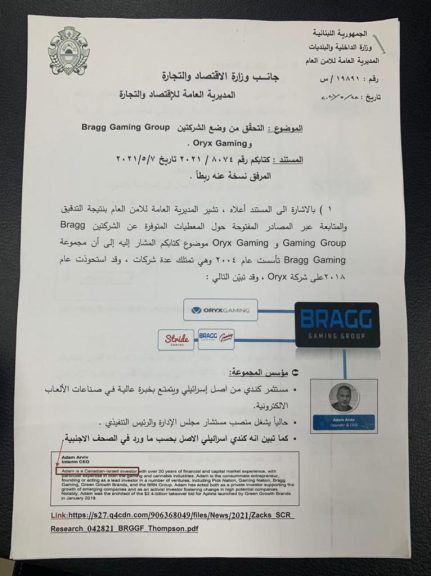 في 11 تموز 2020، أطلق كازينو لبنان استدراج العروض لتطوير وإدارة منصة الألعاب عبر الإنترنت Betarabia.com لمدة أربع سنوات، وقد أعربت العديد من الأطراف المتقدمة عن اهتمامها بهذه المنصة، بما في ذلك شركة Oryx Gaming. وبعد دراسة الملف، أوعز مكتب مقاطعة إسرائيل، التابع لوزارة الاقتصاد ومقره حاليًا في القاهرة، في 7 أيار 2021، بوقف إبرام العقد مع شركة Oryx Gaming التابعة لمجموعة Bragg Gaming، لأنها مدارة من قبل إسرائيليين.